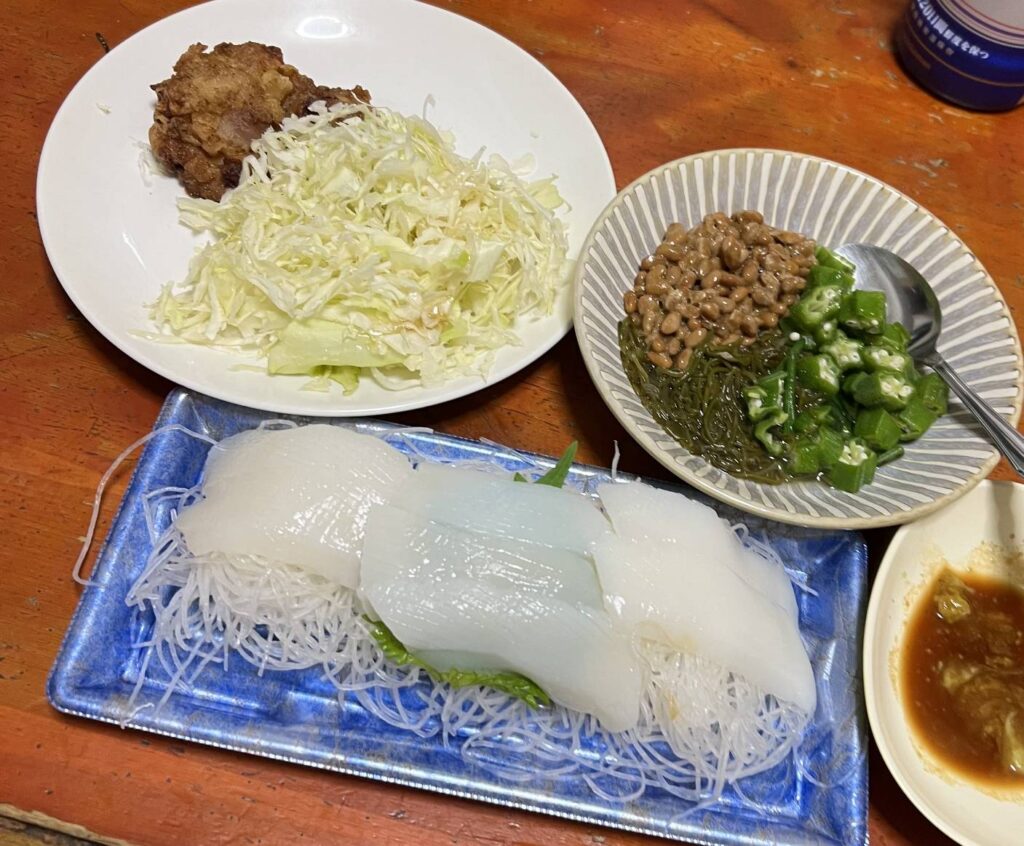 主菜はイカの刺身。高タンパク・低脂質で、噛み応えがあるため満腹感も得やすい。