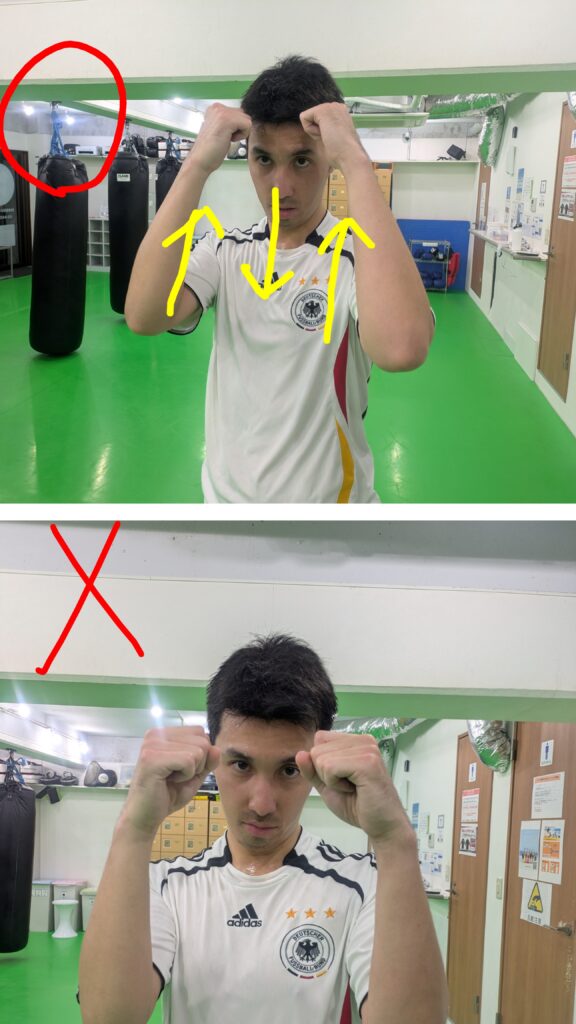 構えた状態で肘を下げてしまうと肩甲骨の可動範囲が狭くなるためかたまってパンチがだしづらくなります。
