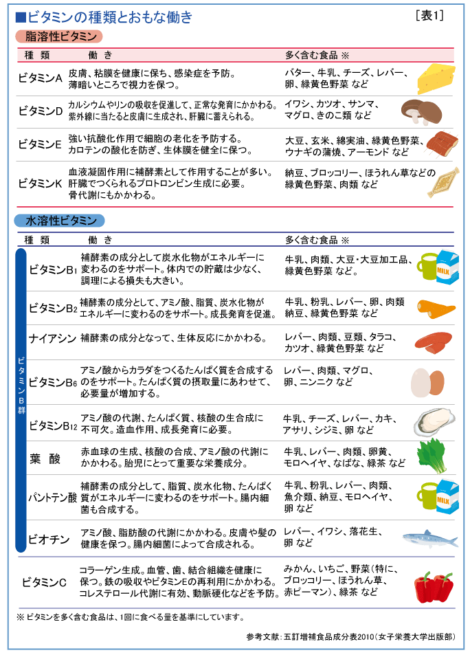 ビタミンB12働き:赤血球をつくる、神経の働きを維持食品:魚、肉、卵(植物性には少ない)